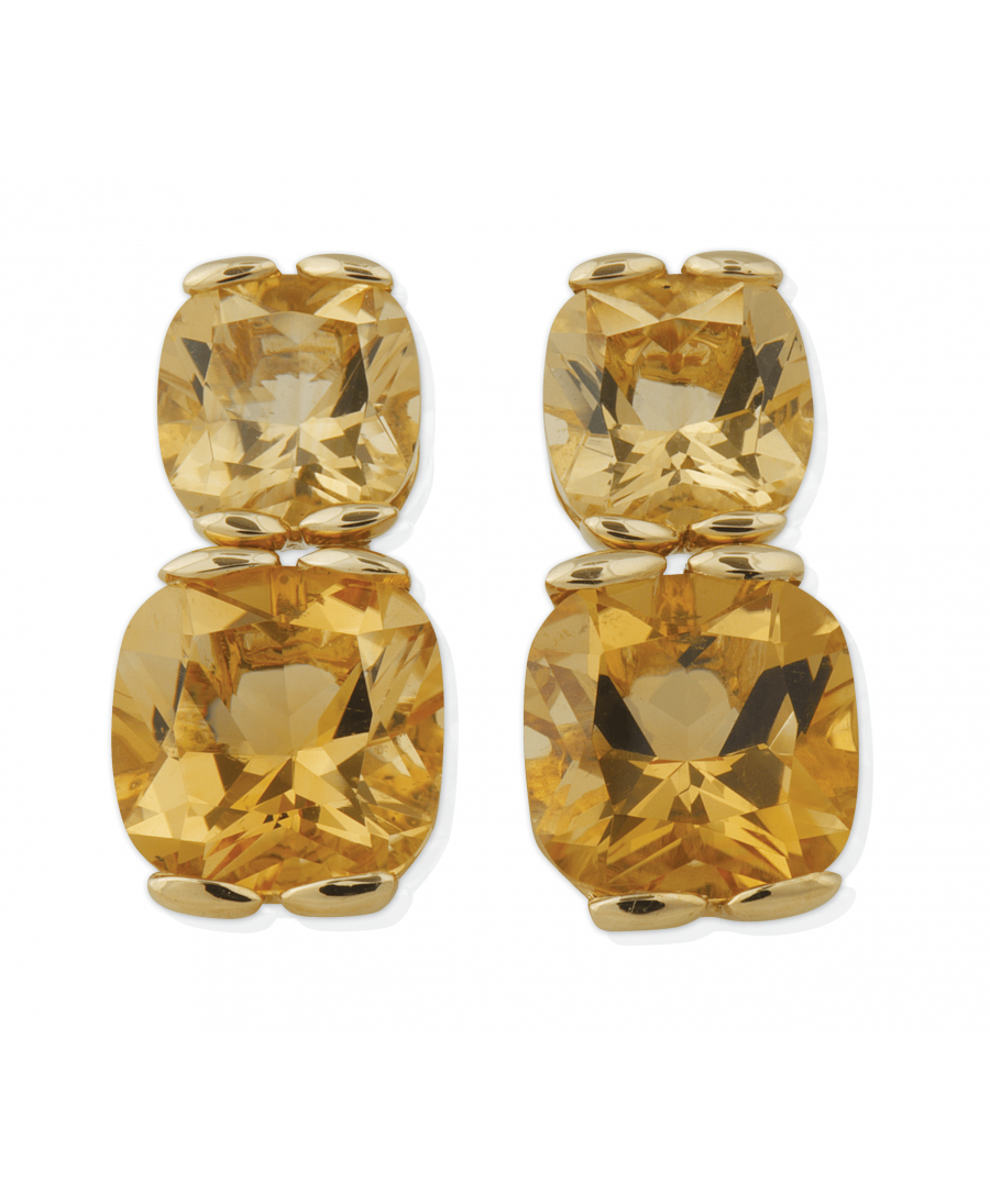 18k yellow gold cushion cut facetted cognac citrine earrings. The stunning citrine has a superb clarity and sits delicately in a gold basket style. Citrine according to folklore is known as the positive aura gemstone and has always been part of the Chic Elegance cocktail gems.