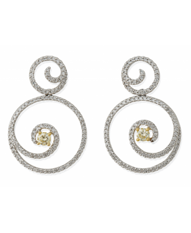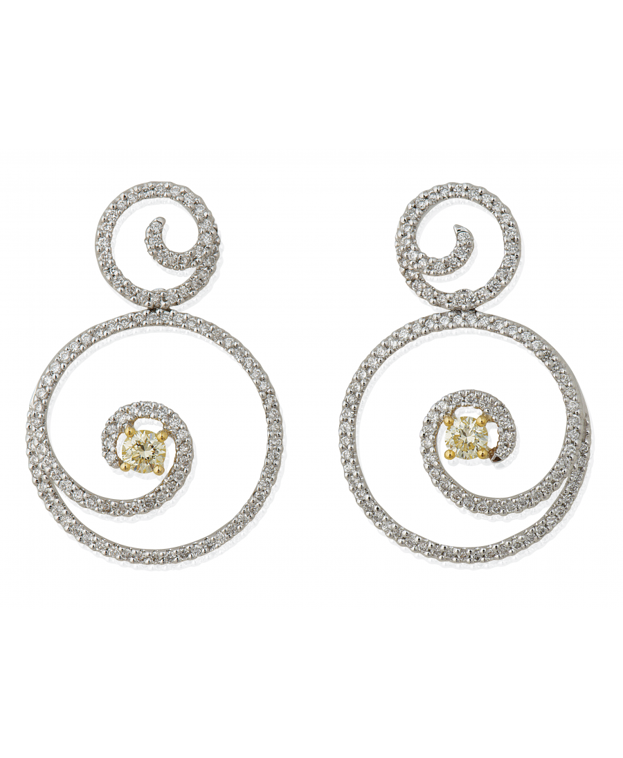 18k designer diamond swirl earrings with round fancy yellow diamond centre stones.