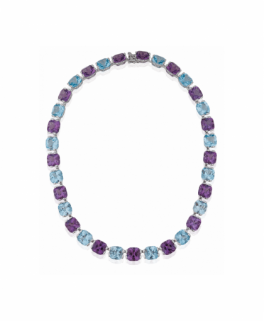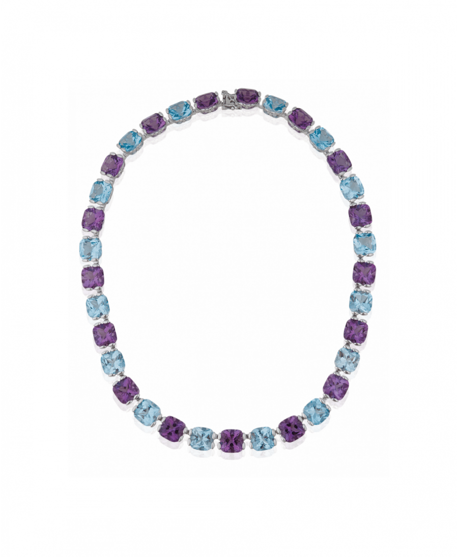 18K White Gold Gemstone Necklace consisting of beautifully cushion cut Topaz, Aquamarine and Amethyst gems, of which each sits in a basket style setting. This is a bespoke piece, contact customer services for further information.