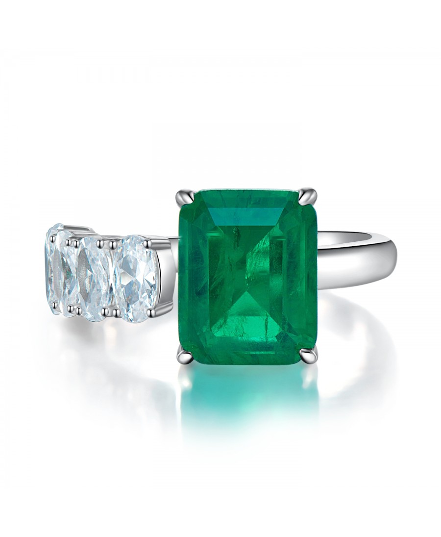 Trendy Emerald Colour Zircon 925 Sterling Silver Open Ring Embellished With Side White Oval Cut Zircon Stones